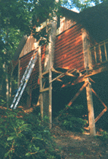 The photo actually shows the rebuild of that scaffold, for it had already been used one time on the other side of the cabin, then torn-down, nails removed, and the wood used again to construct the same scaffolding on the shown side.