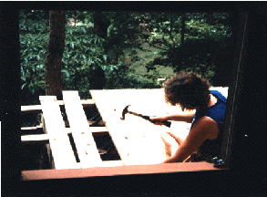 Note the tree-like post around which the planking is being installed.  This is one of those two "straight" whiteoak trees which had been placed downslope to support the edge of the porch and eventually, the porch roof.  (Doesn't look too straight, does it?  Oh well, as we often said: